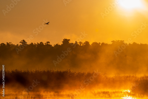 Rozlewiska i bagna o świcie. Bioróżnorodność terenów podmokłych, torfowisk i rozlewisk rzecznych. Ochrona bagien takich jak Dolina Biebrzy w celu ratowania kluczowych gatunków lęgowych zwierząt