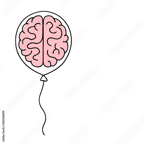 Minimalist line art balloon containing a pink brain, conceptual vector illustration of uplifting mental health and creativity.