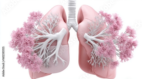 Detailed 3D illustration of human lungs with bronchial tree and alveoli, close up view, isolated on white background