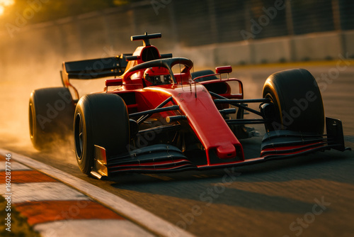 Full-body shot of Formula 1 car racing through corner with visible motion and speed. Concept of motorsport, precision, engineering, adrenaline, and elite racing competition.