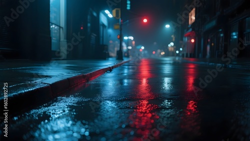 Rainy Night Street with Neon Lights Reflecting on Wet Pavement