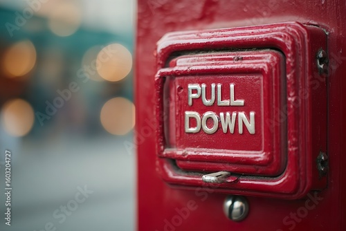 Detailed close-up image of a classic red fire alarm pull station with metallic "PULL DOWN" instructions. Used in emergency situations to trigger a building-wide fire alert. Captures essential fire saf