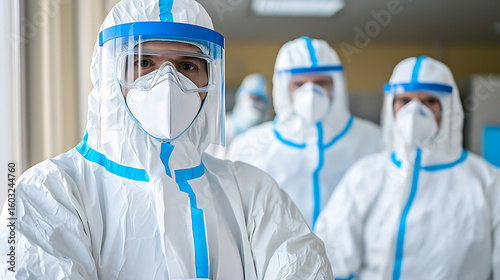 Healthcare Workers in Protective Gear: Doctors or nurses wearing full personal protective equipment to fight infection and provide medical care.