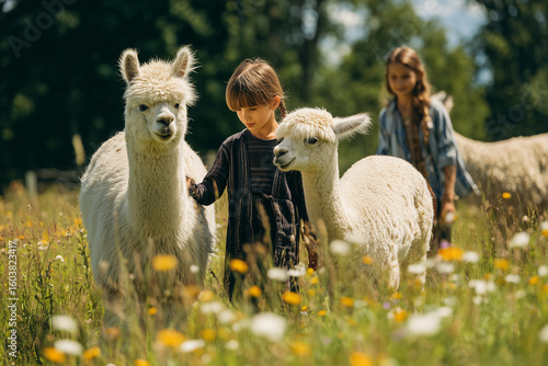Dzieci podczas terapeutycznego spaceru z alpakami. Kontakt ze zwierzętami wspiera rozwój emocjonalny i przynosi radość najmłodszym.