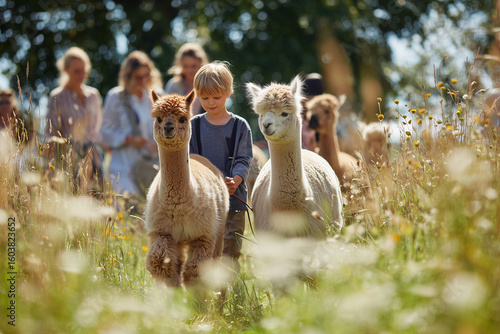 Dzieci podczas terapeutycznego spaceru z alpakami. Kontakt ze zwierzętami wspiera rozwój emocjonalny i przynosi radość najmłodszym.