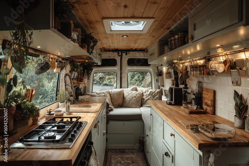 Przytulne wnętrze kampera z nowoczesną kuchnią i wygodną częścią sypialnianą. Jasne kolory i funkcjonalne rozwiązania tworzą idealną przestrzeń do podróży i odpoczynku