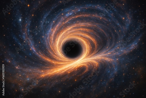 Cosmic event horizon with swirling galaxy matter being drawn into gravitational singularity