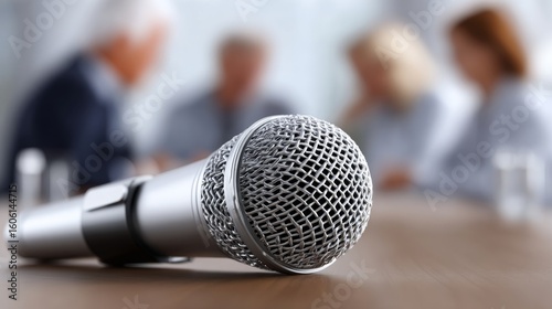 A microphone placed on a table in a meeting room where people are having a discussion in the background.