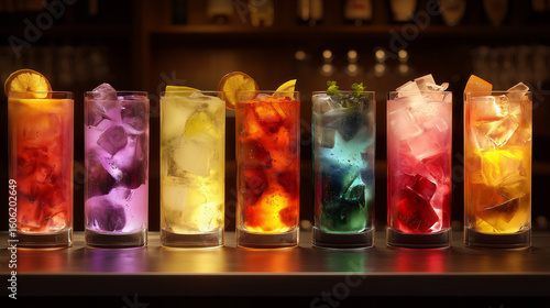 Cocktail lineup of rainbow mixed drinks with lemon garnish and glowing ice