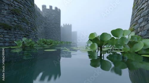Medieval Castle Moat Reflecting Stone Walls with Floating Aquatic Plants and Mist