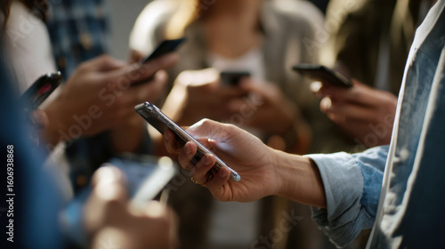 Close-up of multiple people's hands holding and interacting with smartphones, illustrating digital communication, social media, and technology use in a group setting