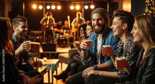 Relaxed hipsters enjoying evening drinks and lively entertainment.
