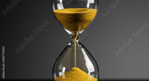 Sand Hourglass of Time: A close-up shot captures the elegant form of a sand hourglass, its transparent structure revealing golden grains flowing relentlessly. The image symbolizes the passage of time.