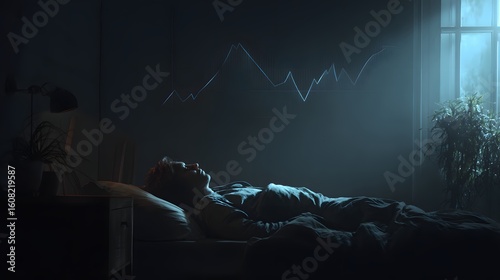A person sleeping while a glowing financial stock chart floats overhead. A concept for financial anxiety, passive income, or the "money never sleeps" principle.