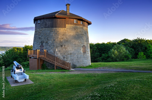 Historic Martello tower on the Plains of Abraham in Quebec City, captured at sunset with a cannon in front. Ideal for themes of military history, tourism, heritage, and scenic architecture.