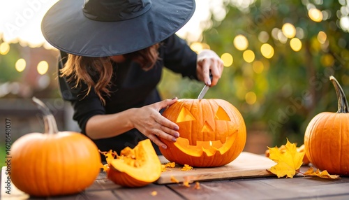 Woman carving pumpkin outdoors