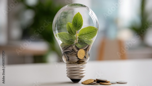 A clear lightbulb, filled with coins and a small plant, sits on a table