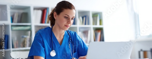 The dedicated nurse focused on her laptop in a professional healthcare setting.
