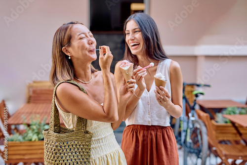 Two cheerful female friends enjoying ice cream cones together on a sunny day, laughing and having fun
