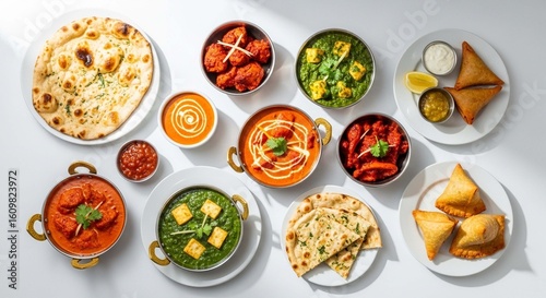 A delicious spread of traditional Indian cuisine featuring various curries, naan bread, and samosas.