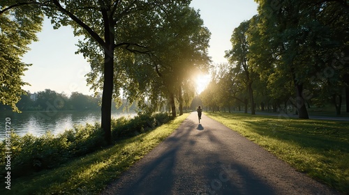 a person restarting jogging, figure receding into a sunlit park pathway, greenery lining both sides, morning light casting long shadows, gradual transition to a panoramic view of.
