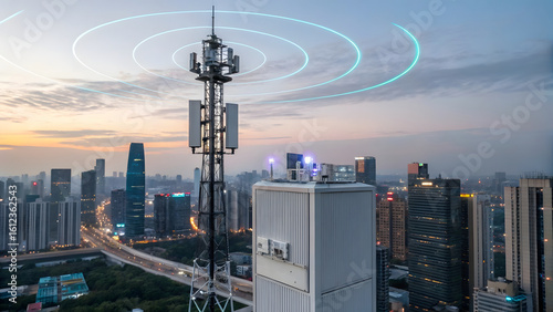A sleek, modern 5G network tower stands tall atop a rooftop in the heart of a vibrant city skyline at twilight