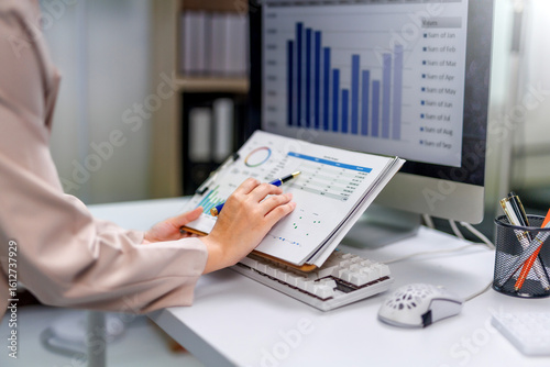 Businesswoman pointing at charts and graphs displayed on a clipboard and computer screen, analyzing financial data and investment strategy in a bright office environment
