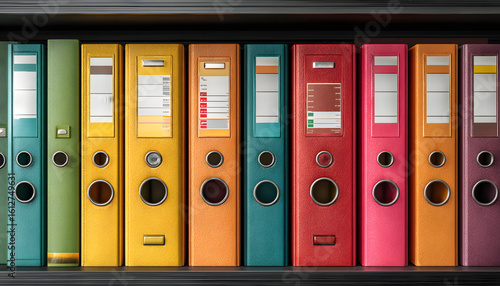 Organized technical documentation manuals in binders. Information stored, accessible. Office documents, reports, handbooks for business, education. Archive, data, files, paperwork, information,