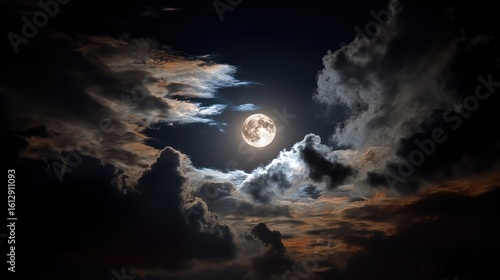 A full moon shines brightly through dramatic, layered clouds during a nocturnal sky