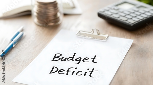 Budget Deficit Document: Analysis of financial shortfall with stacked coins, pens, and calculator on wooden surface for fiscal planning.