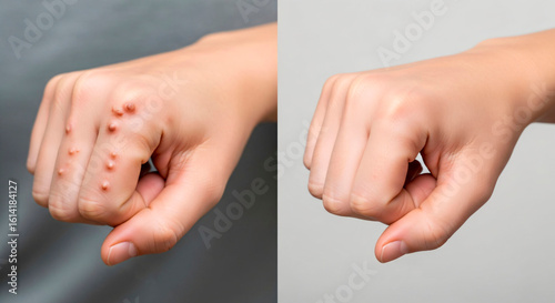 Caucasian woman's hand with severe wart before and after treatment, medical concept of skin health.