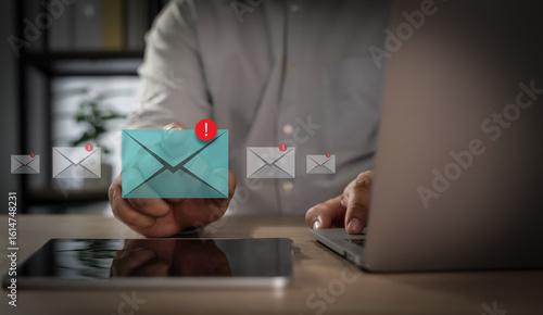 Mail Communication Connection Person managing email notifications digital devices, with alert icons indicating new messages and urgent updates