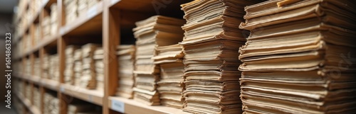 Rows of aged paper documents fill wooden shelves in an archive room. Stacks of files and paperwork suggest extensive records management, historical research, and business organization.