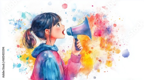 メガホンで叫ぶ少女のカラフルな水彩イラスト