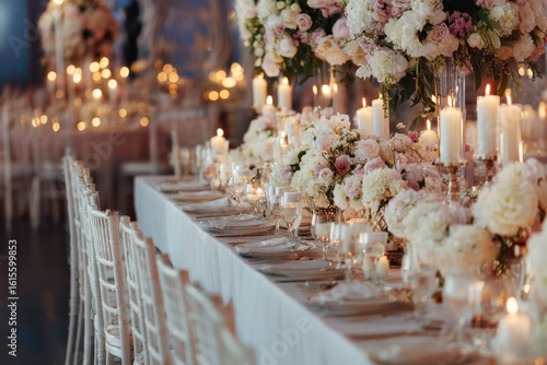 Wedding reception with beautifully decorated tables candles and flowers for the newlyweds