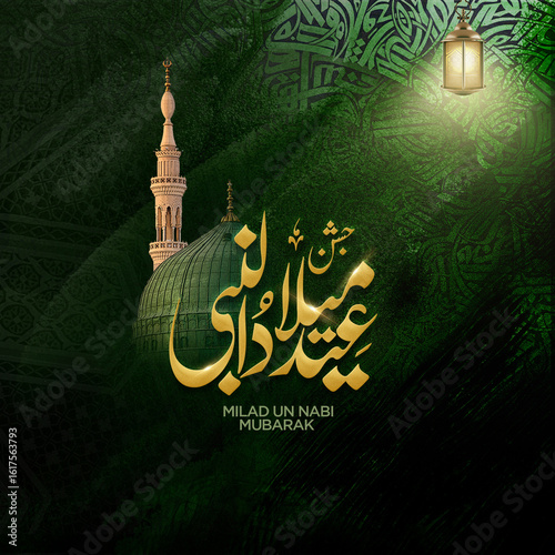 Masjid-e-Nabvi. Happy Eid Milad Un Nabi. celebrating 12 rabi ul awal. (Translation Birth of the Prophet) green ang gold background