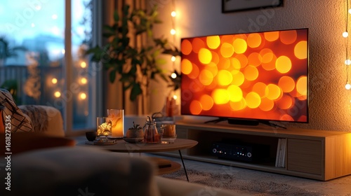 Cozy living room, evening TV, warm lights, relaxing atmosphere, home comfort