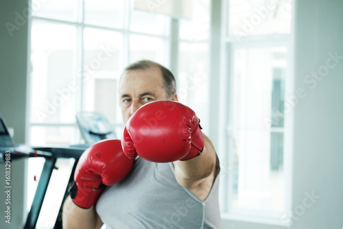 An overweight man wearing boxing gloves exercising by boxing at the gym boxing workout.