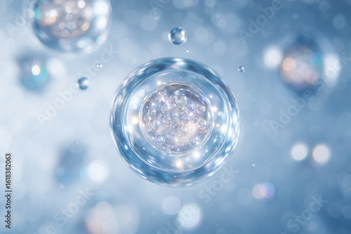 透明な美容成分の粒子が輝く未来的なイメージ – 潤い・浸透・サイエンス / Futuristic Image of Glowing Transparent Beauty Particles – Moisture, Absorption, Science