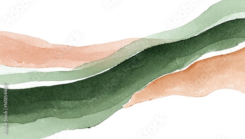 Abstract watercolor washes in muted peach, green, and dark green, flowing in overlapping, wavy lines on a white background