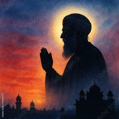 Guru nanak jayanti background with guru nanak dev ji silhouette in watercolor style.