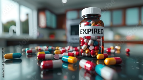 A colorful bottle of expired medication surrounded by scattered capsules on a kitchen counter, highlighting the importance of checking expiration dates.