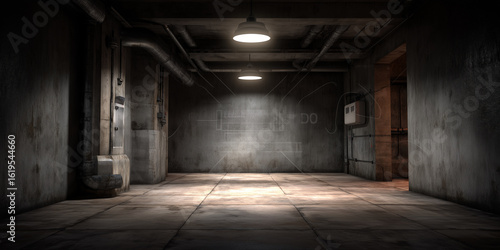 Ein 3D-gerenderter dunkler, schmuddeliger Industriekellerraum mit einer dezenten weißen Hintergrundtextur bietet die Kulisse für Fotografie und Bildbearbeitung. Industrie Vintage