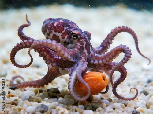 A small octopus is eating an orange in its tank, which has many white and brown tentacles with some black dots on them
