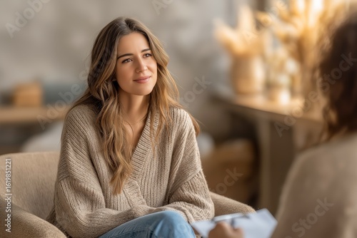 Woman having a therapeutic session, discussing emotional well being, counseling session, female