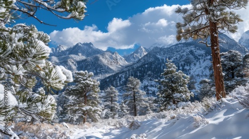 A snowy landscape with snow covered trees and mountains under a partly cloudy blue sky in winter time