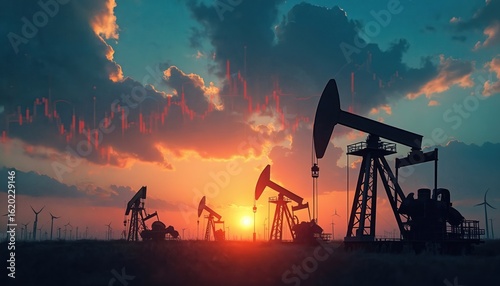 Oil rigs and stock market charts overlayed against a dramatic sunset sky. Symbolizes energy sector finance, commodity trading, investment growth, and economic volatility.