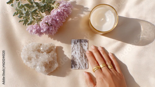 Hand is laying on a table with a crystal, a tarot card, and a candle.