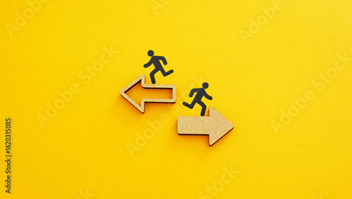 Choosing separate ways moving to opposite destinations shown by two icons of running people. Conflict and disagreement