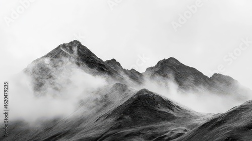 Dramatic black and white mountain peaks shrouded in thick fog, creating a moody and atmospheric alpine landscape.